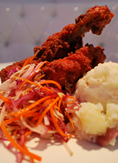 At first glance, it’ll look like a heaping plate of leg, thigh and breast. But upon further inspection, you’ll see that the chicken has taken on a slight reddish hue. That’s because your precious fried bird has been pre-soaked in AC’s signature red velvet cake batter, then dredged in toasted, crumbled bits of red velvet cupcake before being dipped in a frying pan. You know, as one does.